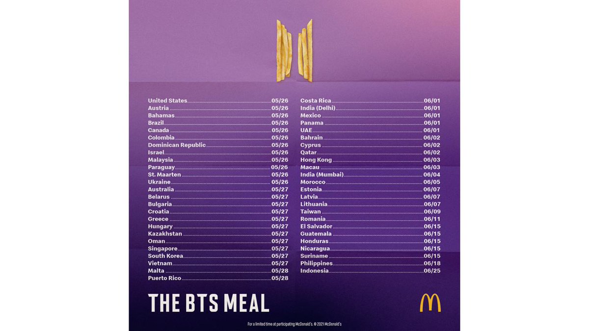 The BTS Meal will be available at Malaysias McDonalds stores starting 26 May 2021. All McDonalds outlets in Malaysia. In Indonesia the New York Times reported that many McDonalds outlets were forced to close due to the crazy demand for the BTS meal that resulted in many delivery riders crowding McDonalds restaurants there and violating.
